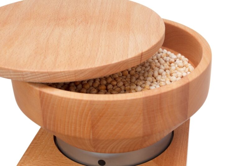 > Funnel, lid, spout: solid beech, treated with natural vegetable oils - Grinding chamber: food-safe plastic (BPA-free)